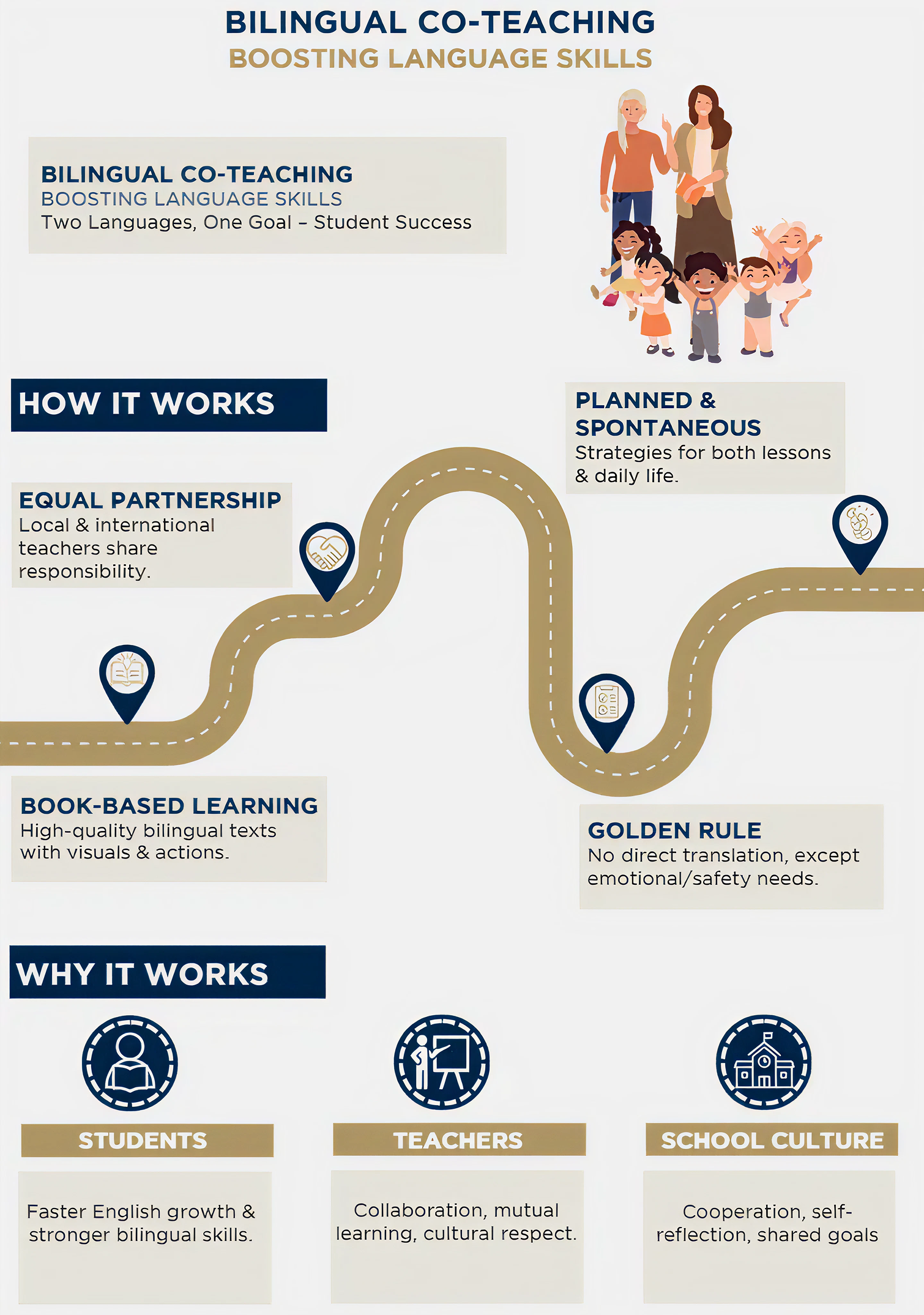 Firstly, co-teaching significantly enhances local teachers’ willingness to contribute their expertise to the instructional process, fostering mutual learning and collaboration between local and international educators. This smooth, efficient, and enjoyable exchange of knowledge and practices is particularly evident during the planning phase of co-teaching. It also creates a culture of cooperation, respect and self-reflection.