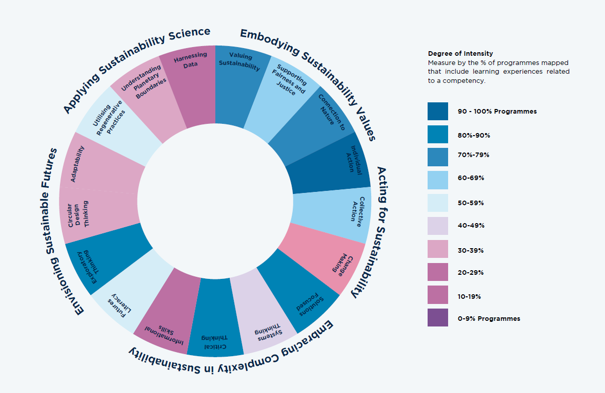 The World’s Largest Lesson (WLL) has proposed 17 sustainability competencies that young people need – see figure 3. Their research looked at the extent to which learning experiences related to these competencies were included in 154 learning programs in 6 countries; the findings are summarised in figure 4. Among other things, they found a widespread emphasis on instilling sustainability values which leads to individual action (personal behaviour changes), but less emphasis on information skills, systems thinking and changemaking.